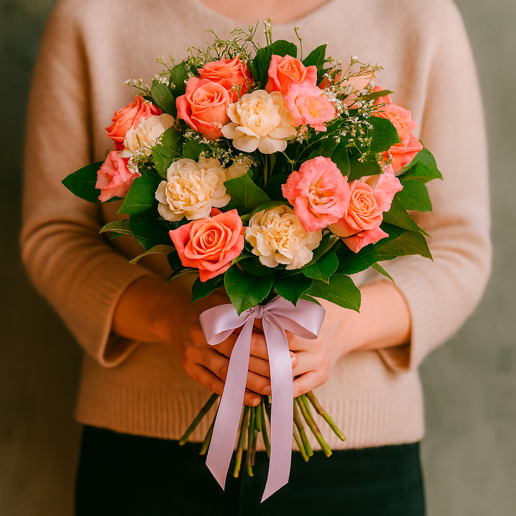 Розово-персиковые розы, кремовые гвоздики и розовые эустомы создают нежное сочетание в этом букете. Зелень добавляет свежести и объёма. Букет перевязан атласной лентой пастельного оттенка. Возможны варианты упаковки: матовая плёнка или крафт-бумага. Прекрасный выбор для подарка на день рождения для любимой.