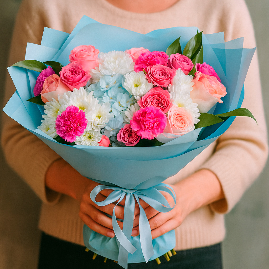 Розовые пионовидные и одноголовые розы, голубая гортензия, белая хризантема и гвоздика создают гармоничную композицию. Букет оформлен в нежно-голубую матовую плёнку и перевязан белой лентой. Возможны альтернативы оформления: крафт-бумага или декоративная сетка. Прекрасный выбор для подарка на день рождения для любимой.