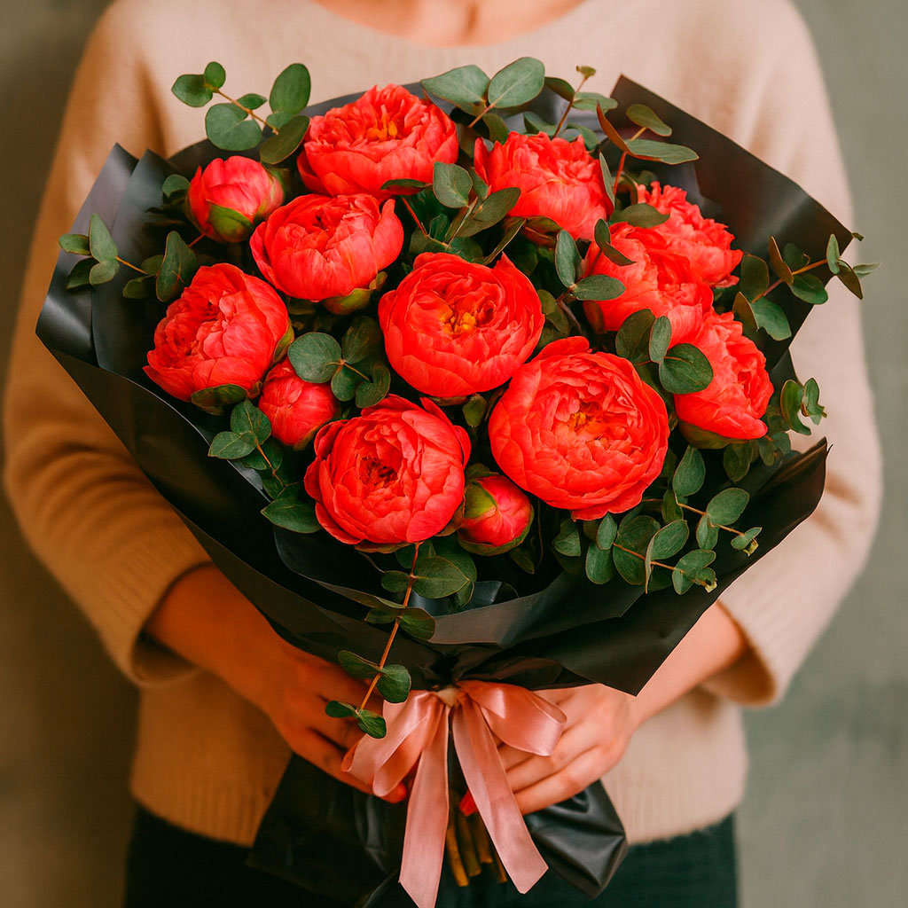 Коралловые пионы в сочетании с эвкалиптом создают изысканную композицию, наполненную свежестью и яркими оттенками. Букет оформлен в матовую плёнку с чёрной и розовой лентой, подчёркивающей его элегантность. Альтернативно можно использовать крафт-бумагу или декоративную сетку. Прекрасный выбор для подарка на день рождения для любимой или мамы.