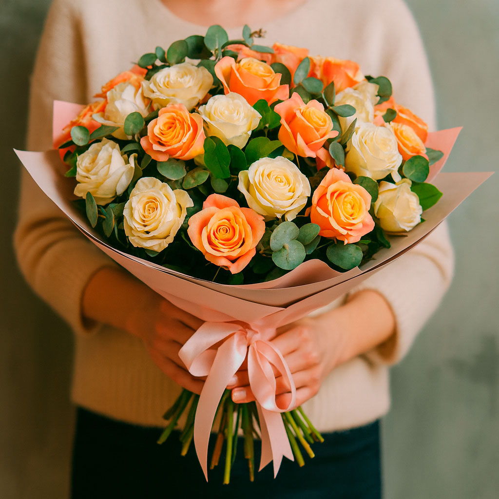 Роскошный букет из кремовых и оранжевых роз, дополненный свежими веточками эвкалипта, создаёт атмосферу нежности и изысканности. Упакован в матовую плёнку и перевязан атласной лентой, он станет ярким акцентом любого события. Возможны альтернативы упаковки: крафт-бумага или декоративная сетка. Прекрасный выбор для подарка на день рождения или для любимой.