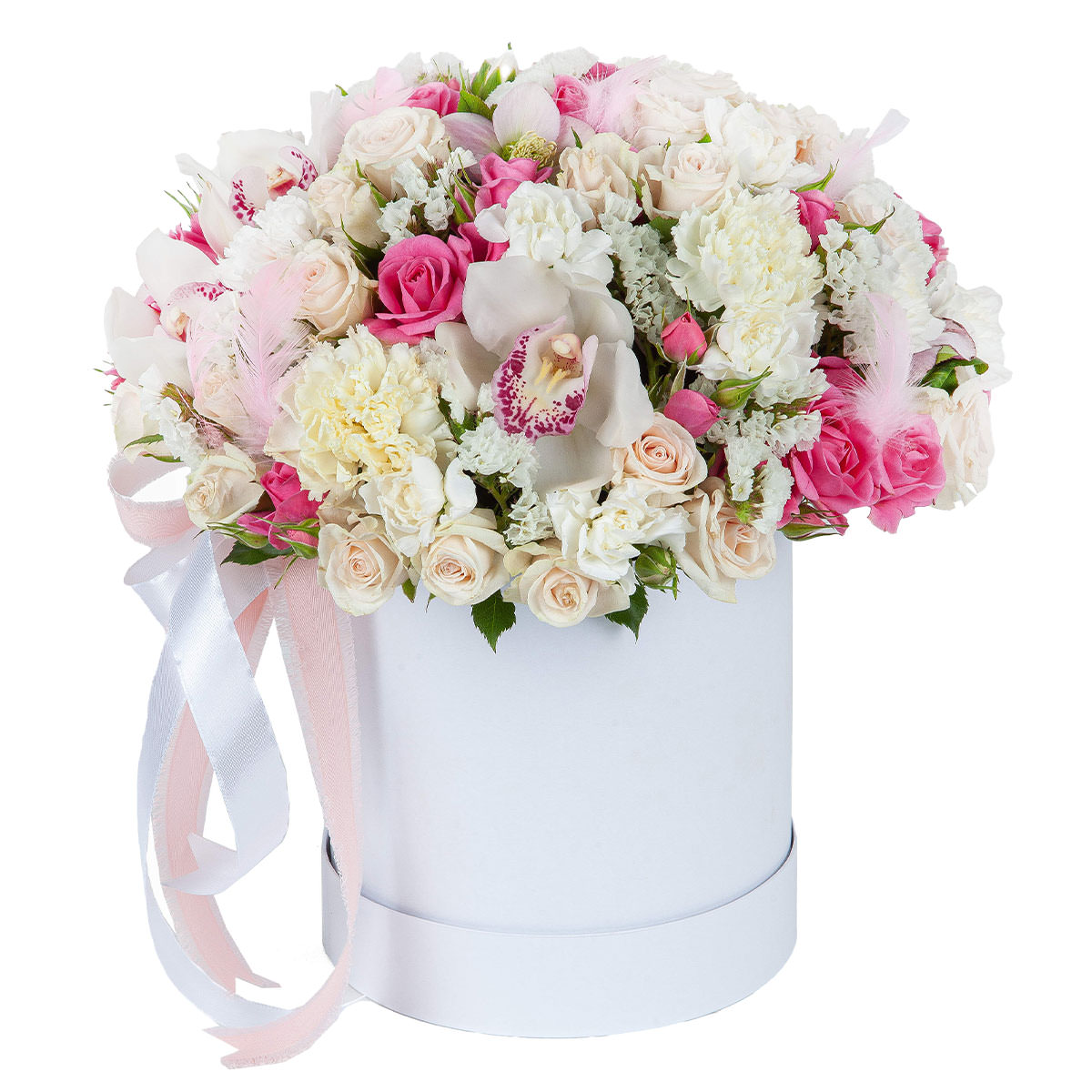Эта изысканная цветочная композиция сочетает в себе белоснежные орхидеи, розовые и кремовые кустовые розы, белые гвоздики и статицу, дополненные декоративными перьями. Все цветы аккуратно расположены в элегантной шляпной коробке, перевязанной лентой. Для более оригинального оформления можно выбрать бархатную или атласную коробку. Прекрасный подарок для любимой на годовщину или для мамы на день рождения.