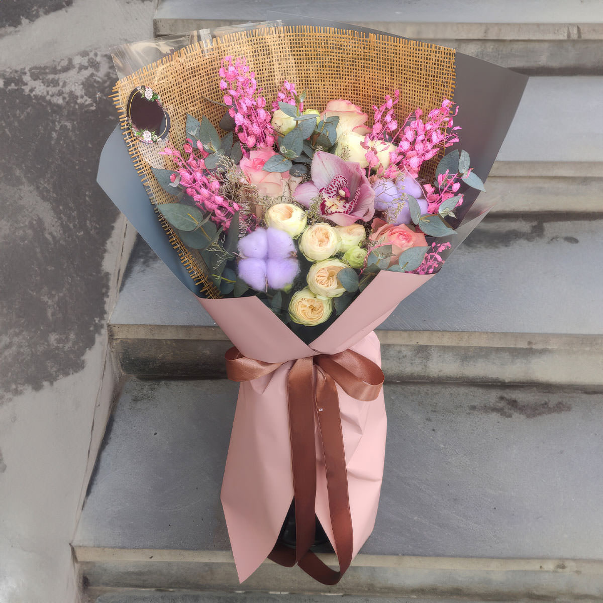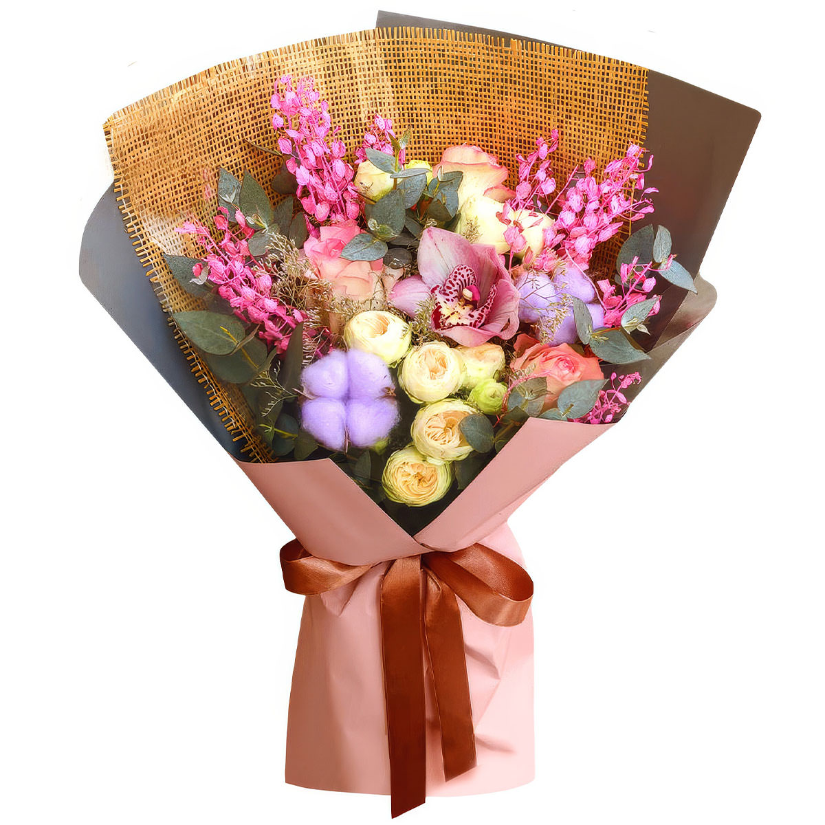 | Состав: | Розы, Хлопок, Эвкалипт, Кустовые розы, Орхидеи, Пионовидные розы |