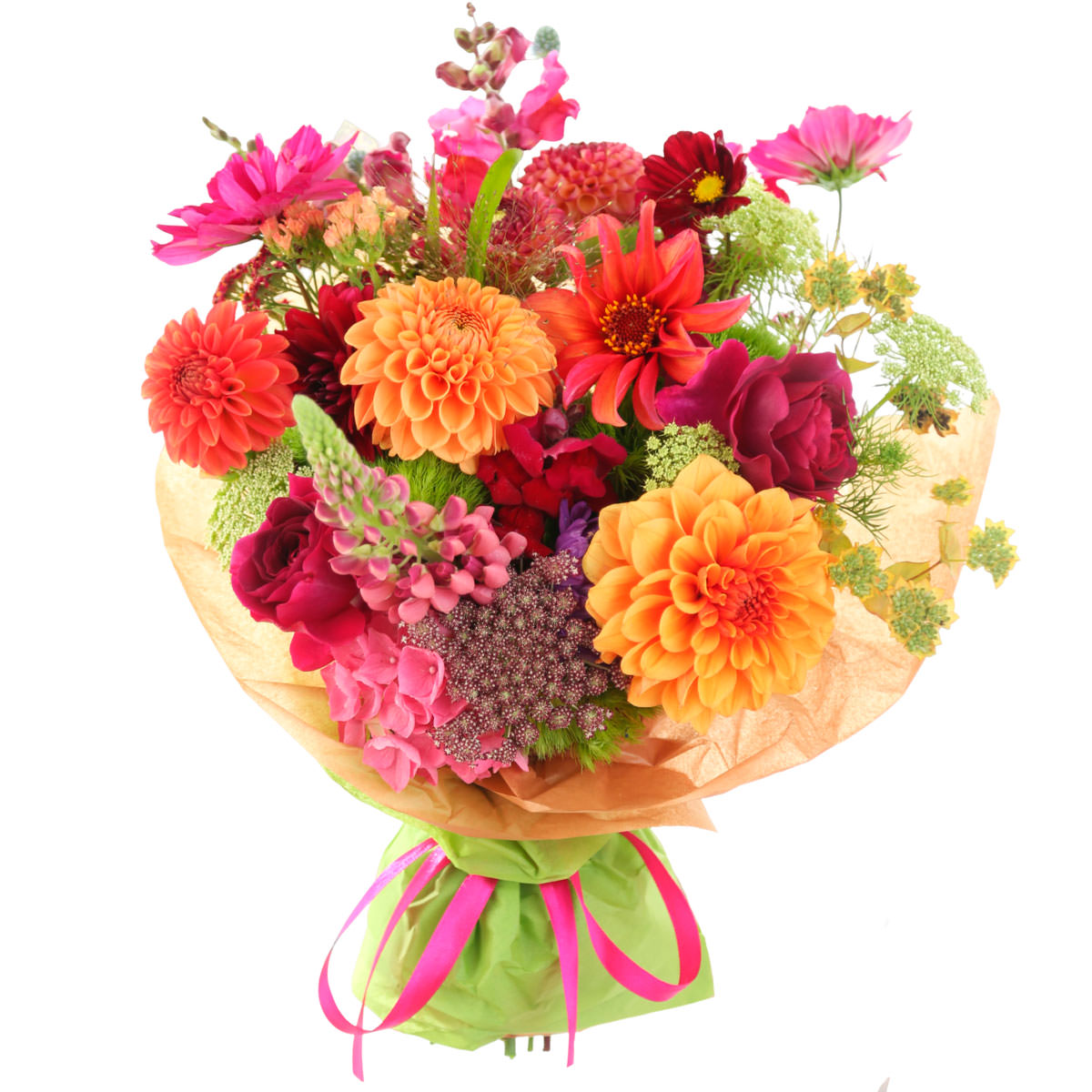 Яркие красные и оранжевые георгины в сочетании с розовыми люпинами и гортензиями создают атмосферу радости и тепла. Космея и персиковая статица добавляют нежности, а зелень завершает композицию. Букет перевязан яркой розовой лентой и обернут в крафт-бумагу. Альтернативное оформление: матовая плёнка или декоративная сетка. Прекрасный выбор для поздравления с днём рождения или для любимой.