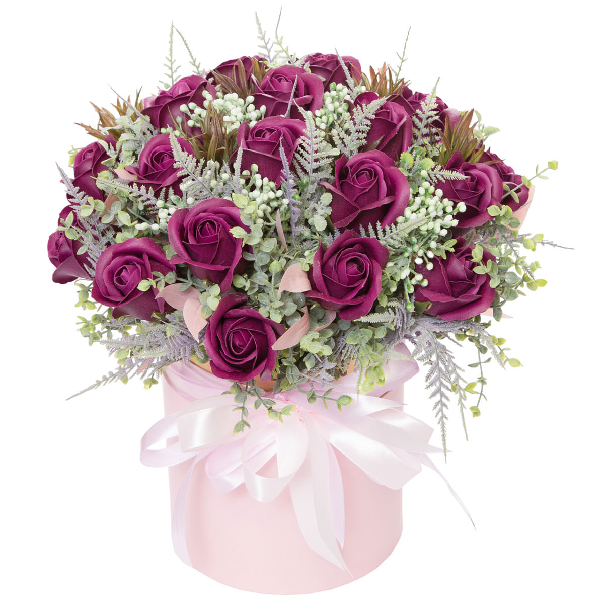 Элегантная композиция из насыщенных фиолетовых роз, дополненная нежной зеленью и белыми акцентами, создаёт атмосферу утончённости. Цветы представлены в изысканной розовой шляпной коробке, перевязанной атласной лентой. Возможны варианты оформления в бархатной или дизайнерской коробке. Прекрасный подарок для любимой на годовщину или день рождения.