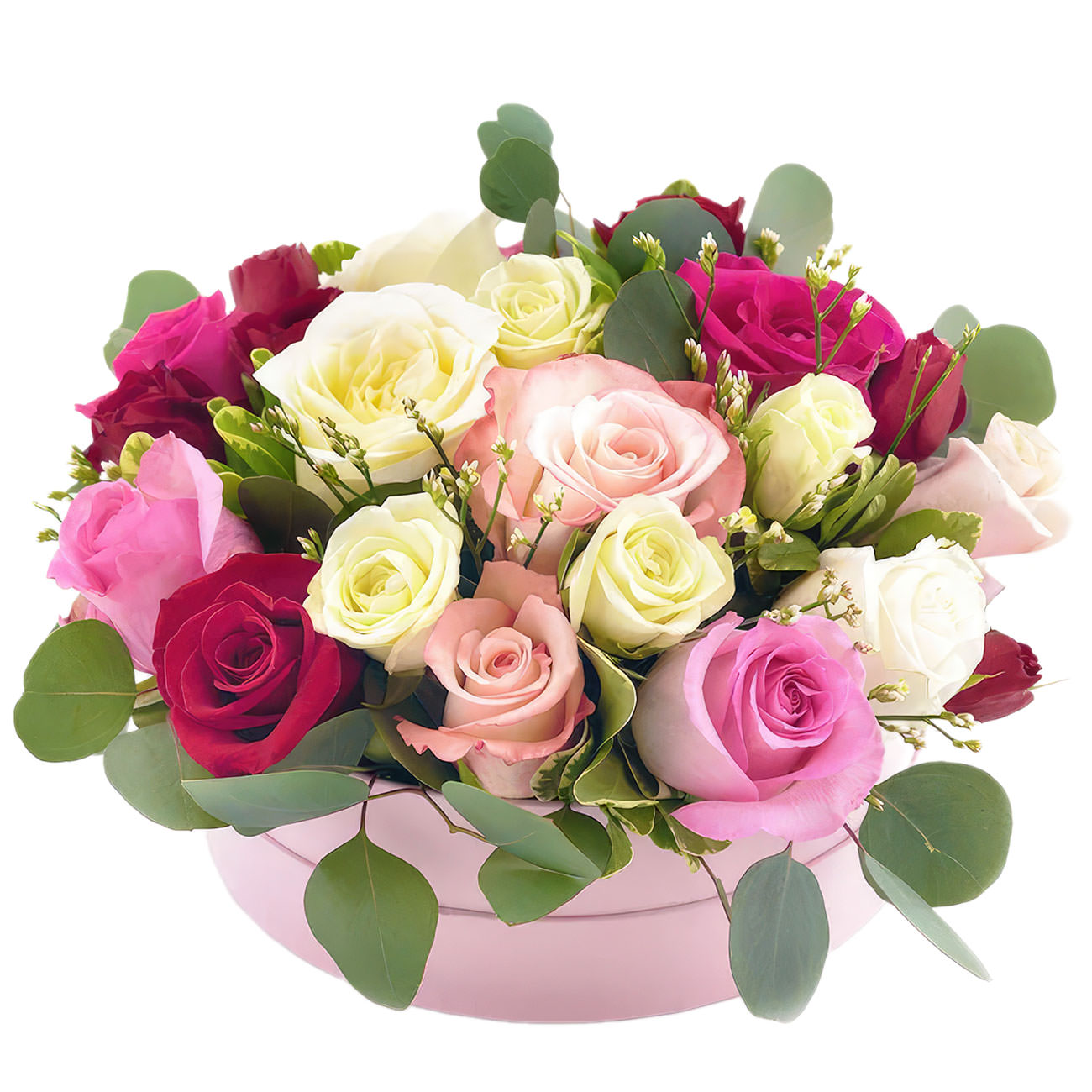 Эта изысканная композиция из кремовых, белых, нежно-розовых и розовых роз, дополненная свежей зеленью, создает атмосферу нежности и романтики. Цветы аккуратно расположены в элегантной розовой шляпной коробке, которая подчеркивает их утонченность. Альтернативно, можно выбрать бархатную или атласную коробку. Прекрасный подарок для любимой на годовщину или день рождения.